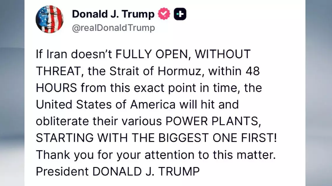 Trump threatens to hit Iran's power plants if Hormuz not opened in 48 hours
