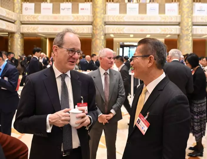 The Financial Secretary, Mr Paul Chan, continued his visit in Beijing today (March 22). Photo shows Mr Chan (left) attending the China Development Forum 2026 and taking a photo with the Founder and the Chief Executive Officer of BrainCo, Dr Han Bicheng (right). Source: HKSAR Government Press Releases