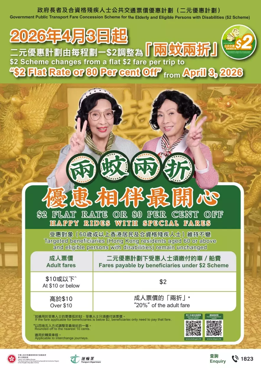 The Government will launch a series of promotional activities to help eligible beneficiaries understand the "$2 flat rate or 80 per cent discount" arrangement. These include Announcements in the Public Interest on television and radio, displaying posters and distributing leaflets at major public transportation networks and through district networks that provide services for the elderly and persons with disabilities, as well as displaying advertisements on public transport. The Labour and Welfare Bureau also holds two briefing sessions today for members of the 18 District Councils and District Services and Community Care Teams to explain the "$2 flat rate or 80 per cent discount" arrangement, so that they can assist in promoting it to beneficiaries of the $2 Scheme and answering enquiries. Moreover, starting from the effective date (i.e. April 3, 2026) of the "$2 flat rate or 80 per cent discount" adjustment, the Government will deploy service ambassadors at MTR stations and public transport interchanges to assist the public and answer their enquiries.