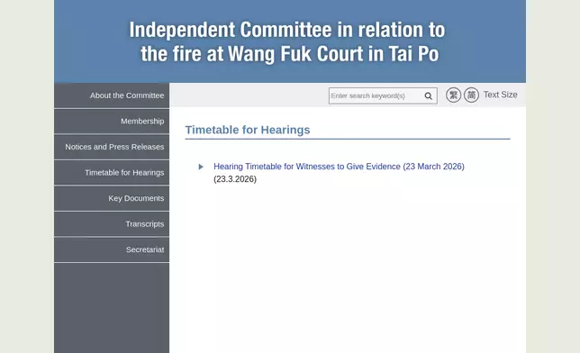 In the second and third rounds of evidential hearings, the Committee will continue to receive oral evidence from witnesses (including oral evidence from Wang Fuk Court residents and representatives of the involved parties). The Committee will release the list of exact witnesses who will be giving evidence at each date of hearing on its website (www.ic-wangfukcourtfire.gov.hk/eng/timetable.html) nearer the time.