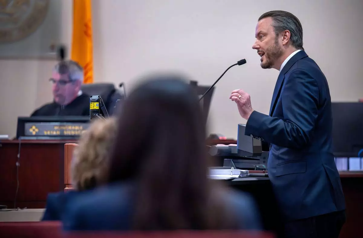 Meta attorney Kevin Huff makes closing arguments, Monday, March 23, 2026, in state court, in Santa Fe, N.M., in a trial where the social media conglomerate is accused of misleading its users about how safe its platforms are for children. (Eddie Moore/The Albuquerque Journal via AP, Pool)