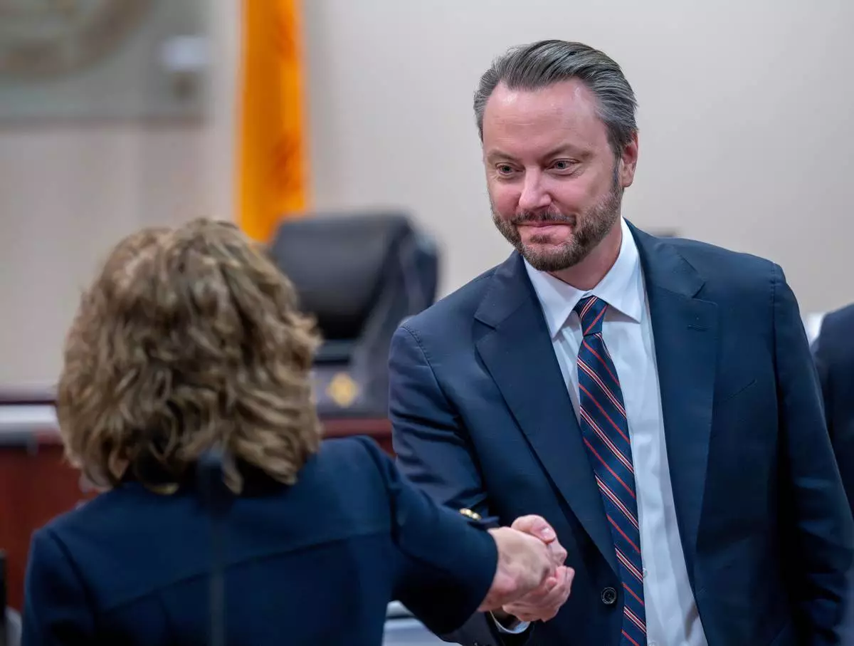Linda Singer, an attorney representing the plaintiff, left, shakes hands with attorney Kevin Huff, representing Meta, after they made closing arguments, Monday, March 23, 2026, in state court, in Santa Fe, N.M., in a trial where the social media conglomerate is accused of misleading its users about how safe its platforms are for children. (Eddie Moore/The Albuquerque Journal via AP, Pool)