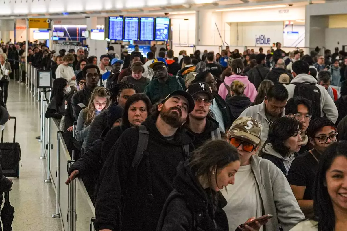 People wait in long TSA security lines at John F. Kennedy International Airport (JFK) in the Queens borough of New York, Monday, March 23, 2026. (AP Photo/Ryan Murphy)