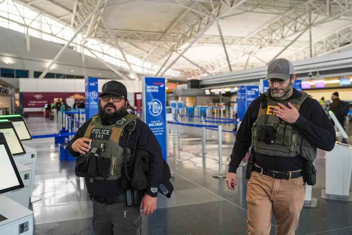 Federal immigration agents walk through Terminal 8 at John F. Kennedy International Airport (JFK) in the Queens borough of New York, Monday, March 23, 2026. (AP Photo/Ryan Murphy)