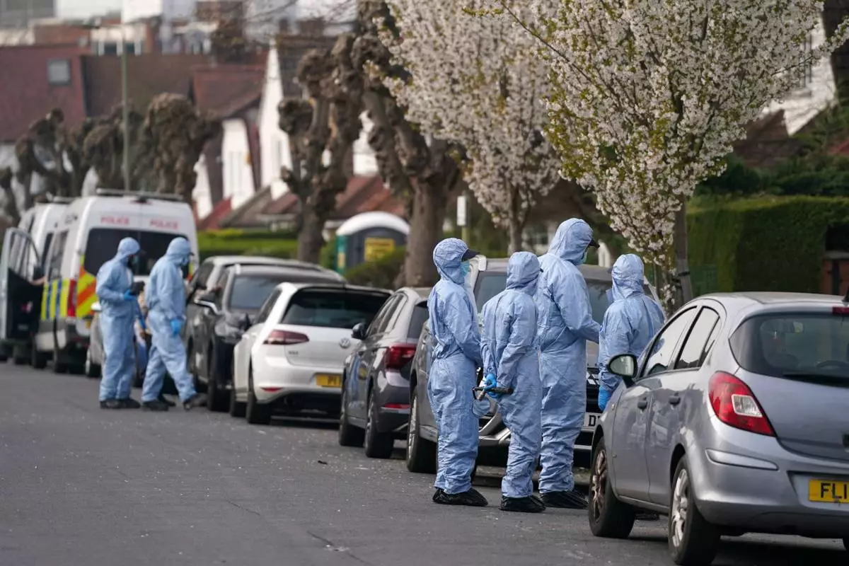 Forensics get ready to investigate the area in Goldedr Green in London, Monday, March 23, 2026 after an arson attack on four vehicles belonging to a Jewish ambulance service, Hatzola Northwest, in London.(AP Photo/Alberto Pezzali)