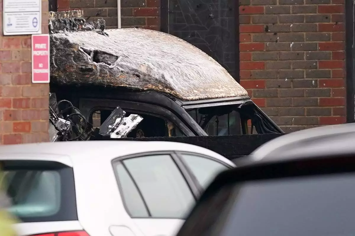 A burnt car is seen in Golders Green, London, Monday, March 23, 2026 after an apparent arson attack on four vehicles belonging to a Jewish ambulance service, Hatzola Northwest, in London.(AP Photo/Alberto Pezzali)
