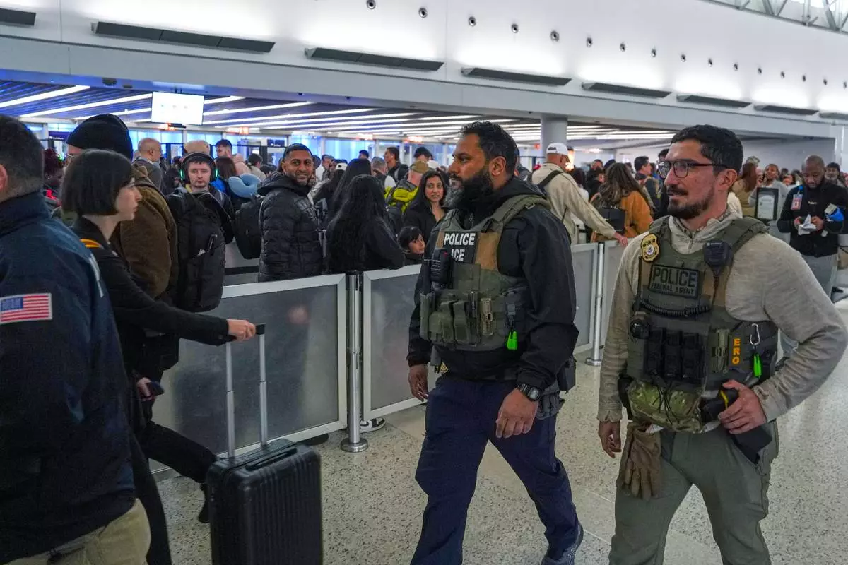 Federal immigration agents are seen at Newark Liberty International Airport, Monday, March 23, 2026, in Newark, N.J. (AP Photo/Angelina Katsanis)