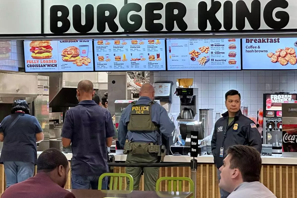 Federal immigration agents are seen at the Hartsfield-Jackson Atlanta International Airport, Monday, March 23, 2026, in Atlanta. (AP Photo/Emilie Megnien)