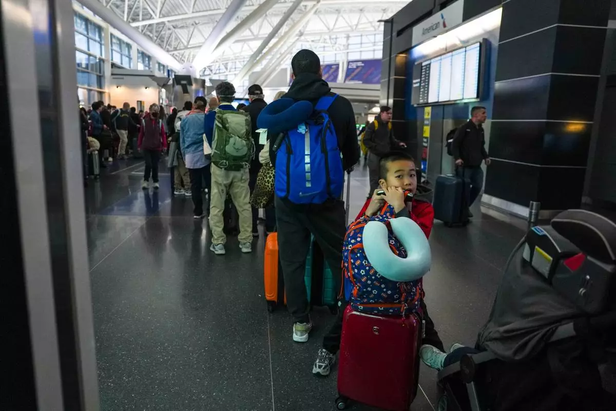 Air travelers progress through the long lines for the TSA security checkpoint in Terminal C at the George Bush Intercontinental Airport, Monday, March 23, 2026, in Houston. (AP Photo/Michael Wyke)