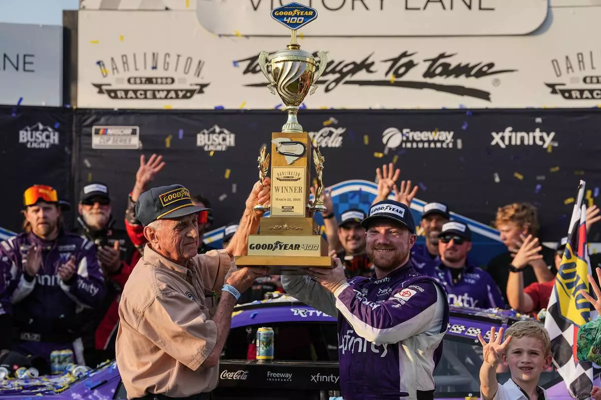 Tyler Reddick, center, celebrates in Victory Lane after winning a NASCAR Cup Series auto race, Sunday, March 22, 2026, in Darlington, S.C.(AP Photo/Matt Kelley)