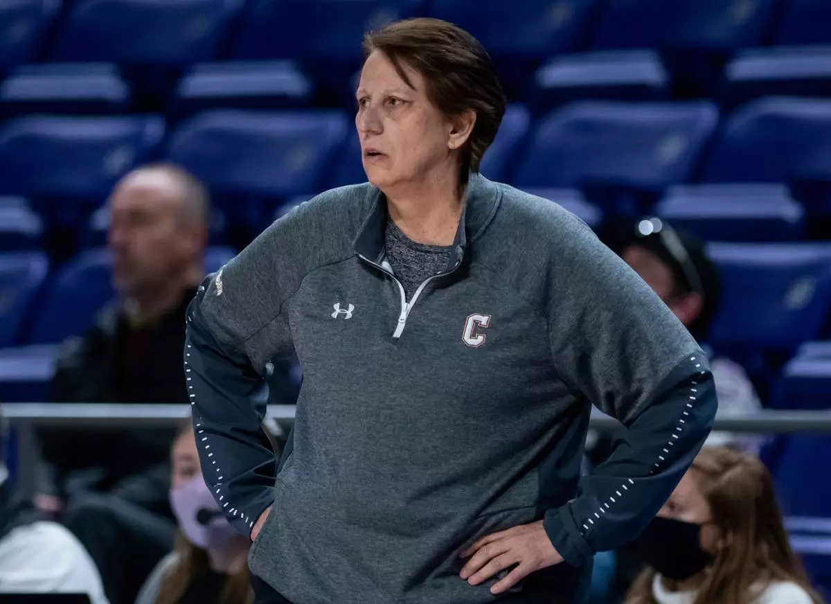 FILE - Charleston head coach Robin Harmony watches her team during the first half of an NCAA college basketball game against James Madison in Harrisonburg, Va., Feb. 18, 2022. (Daniel Lin/Daily News-Record Via AP, File)