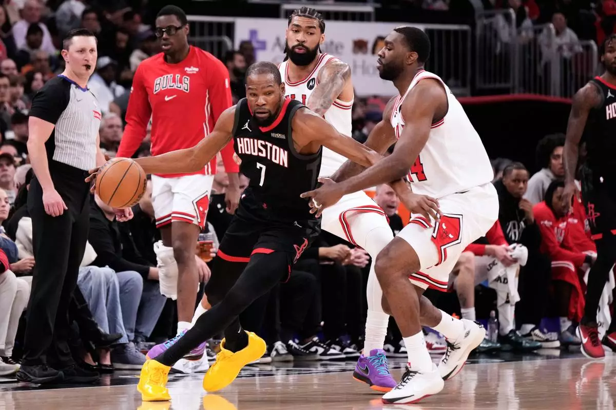 Houston Rockets forward Kevin Durant (7) drives against Chicago Bulls forward Patrick Williams during the first half of an NBA basketball game in Chicago, Monday, March 23, 2026. (AP Photo/Nam Y. Huh)