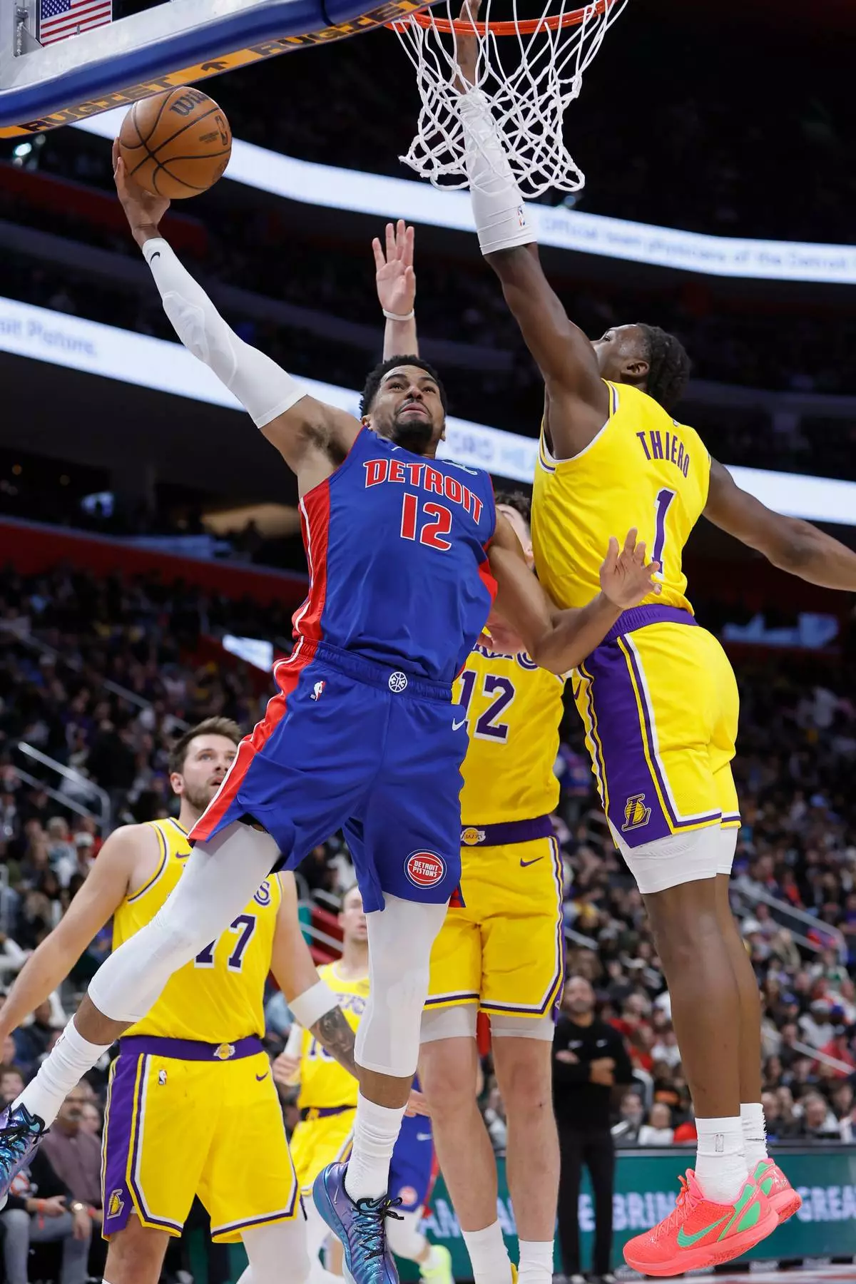 Detroit Pistons forward Tobias Harris (12) goes to the basket against Los Angeles Lakers forward Adou Thiero (1) during the first half of an NBA basketball game Monday, March 23, 2026, in Detroit. (AP Photo/Duane Burleson)