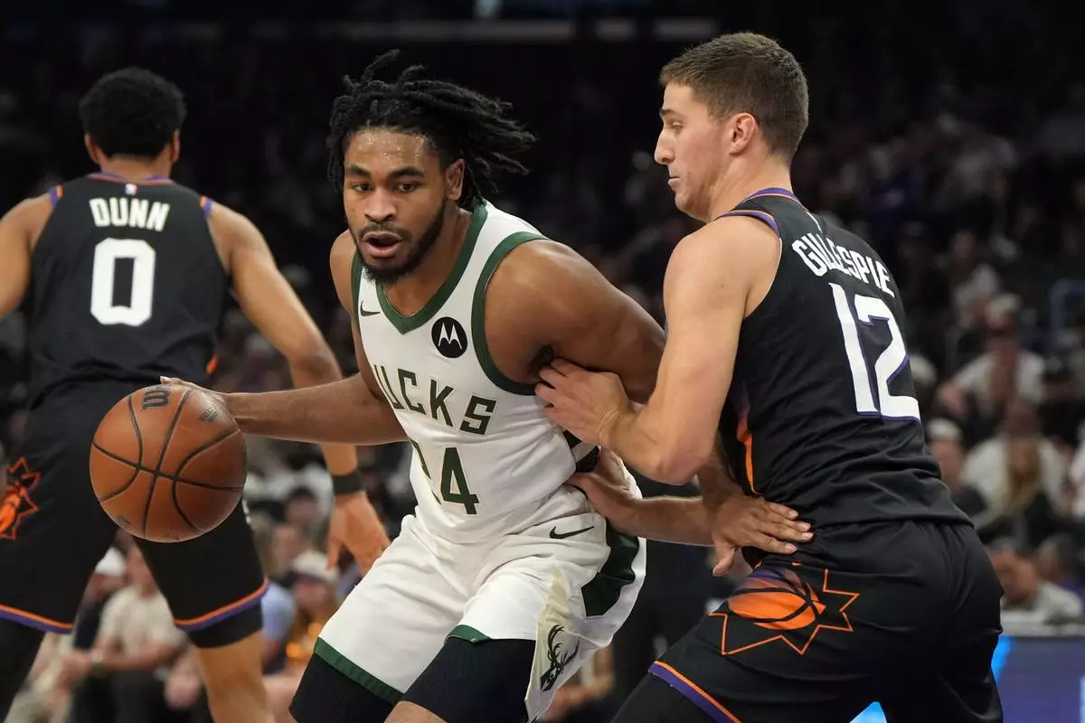 Milwaukee Bucks guard Cam Thomas (24) drives on Phoenix Suns guard Collin Gillespie during the first half of an NBA basketball game, Saturday, March 21, 2026, in Phoenix. (AP Photo/Rick Scuteri)