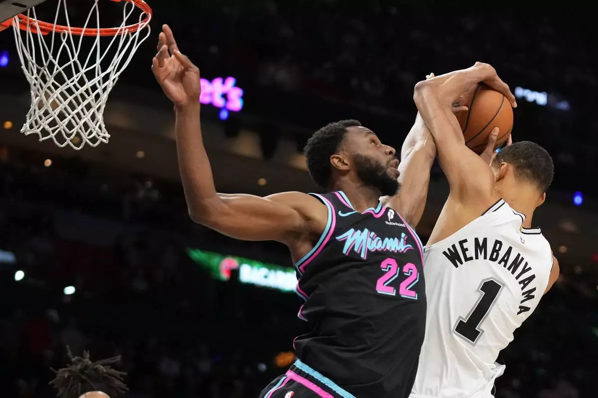 Miami Heat forward Andrew Wiggins (22) goes for a rebound against San Antonio Spurs forward Victor Wembanyama (1) during the second half of an NBA basketball game, Monday, March 23, 2026, in Miami. (AP Photo/Lynne Sladky)