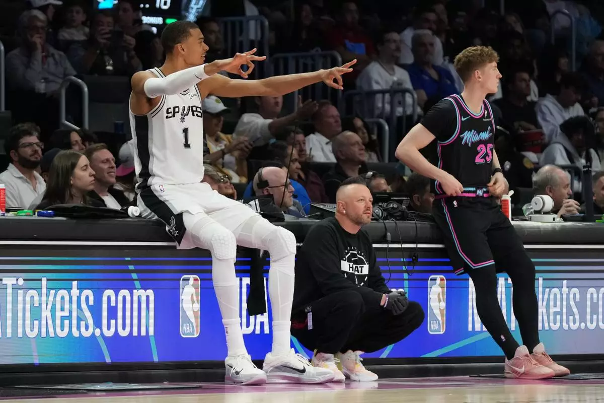 San Antonio Spurs forward Victor Wembanyama (1) reacts during the second half of an NBA basketball game against the Miami Heat, Monday, March 23, 2026, in Miami. (AP Photo/Lynne Sladky)