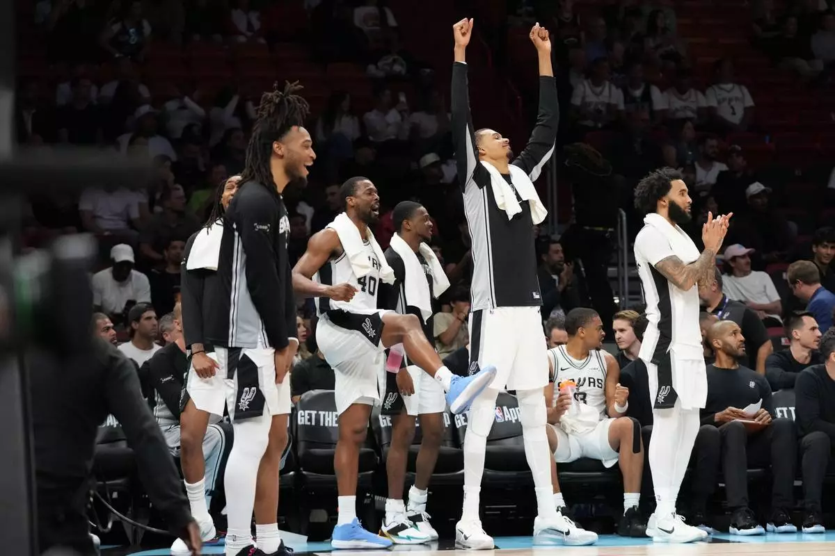 San Antonio Spurs forward Harrison Barnes (40) and forward Victor Wembanyama, second from right, reacts from the bench with their teammates during the second half of an NBA basketball game against the Miami Heat, Monday, March 23, 2026, in Miami. (AP Photo/Lynne Sladky)