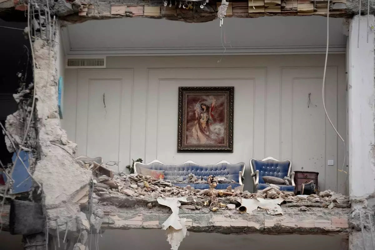 Rubble covers the furniture of a destroyed living room in a residential building hit in an earlier U.S.-Israeli strike in Tehran, Iran, Monday, March 23, 2026. (AP Photo/Vahid Salemi)