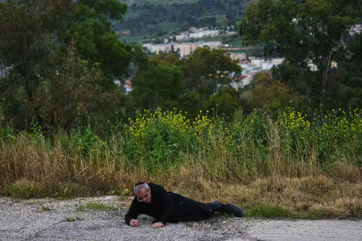 A man takes cover as air raid sirens sound, warning of rockets launched from Lebanon toward Israel, in Kiryat Shmona, northern Israel, Monday, March 23, 2026. (AP Photo/Ariel Schalit)