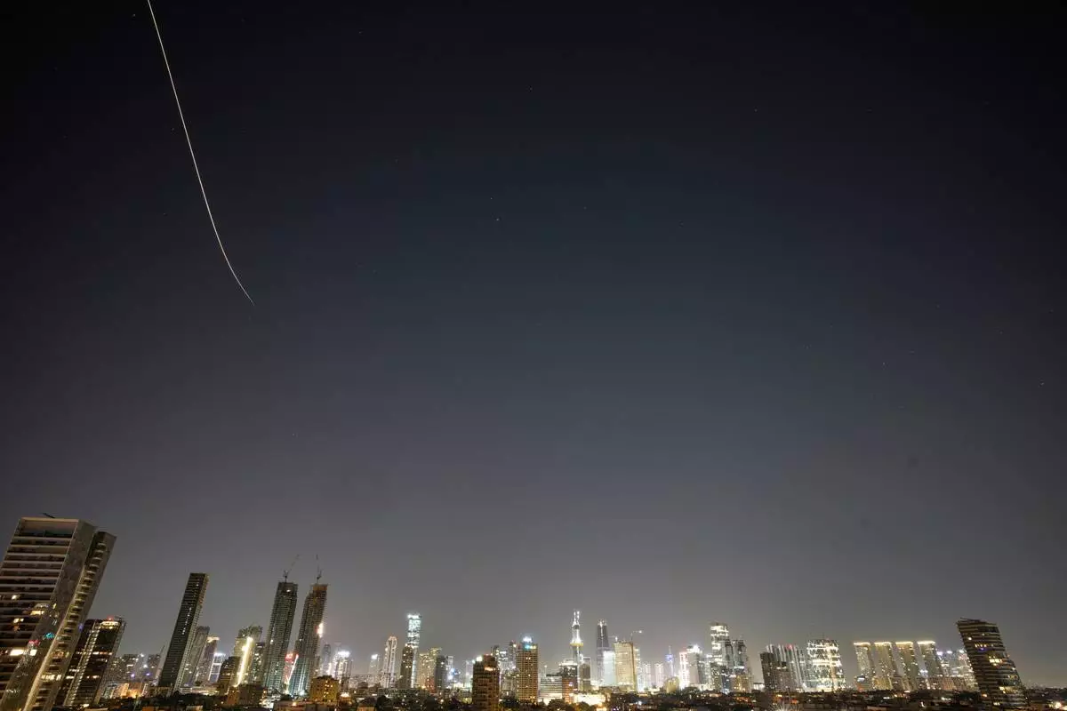 Missiles launched from Iran streak across the sky over central Israel, early Tuesday, March 24, 2026. (AP Photo/Ohad Zwigenberg)