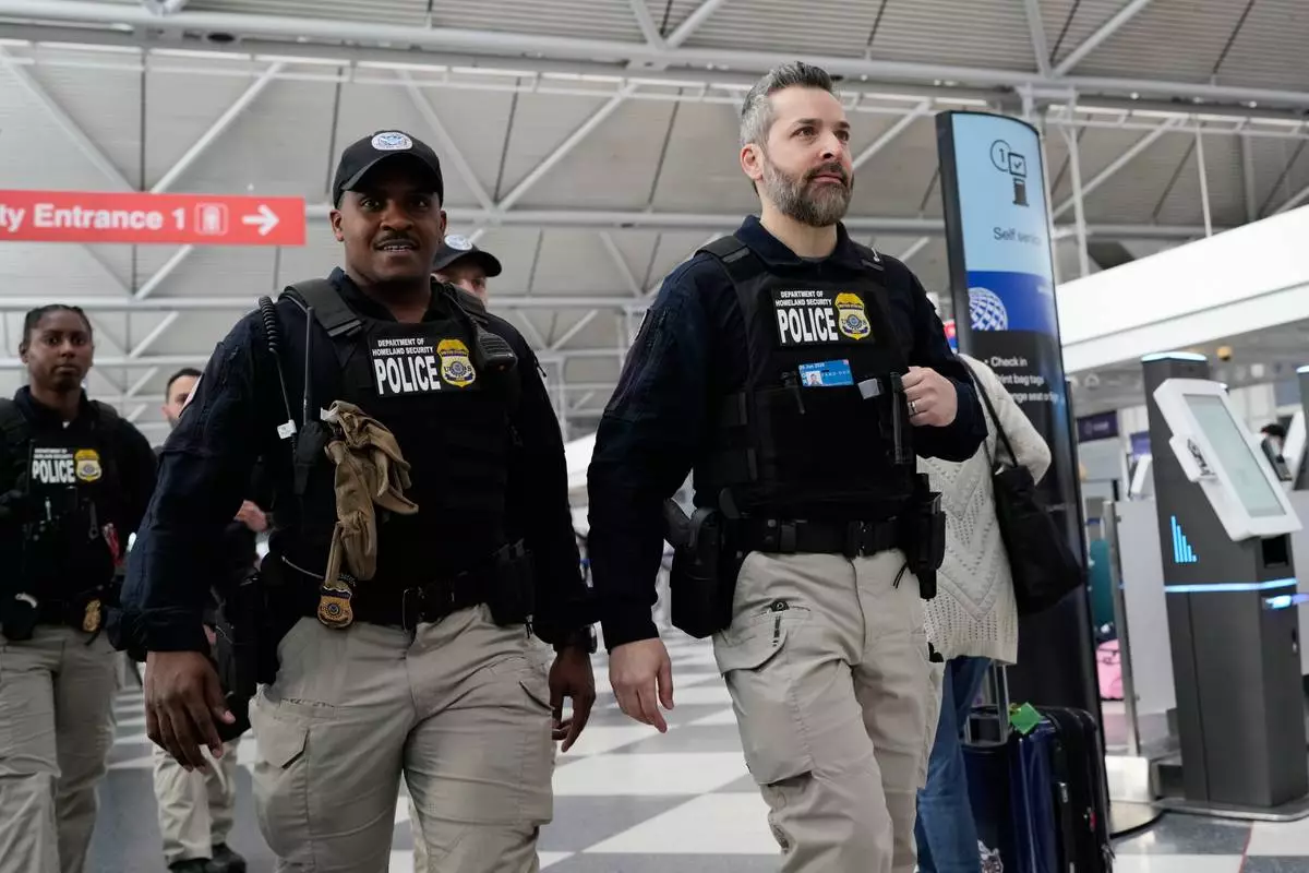 Federal immigration officers walk though the terminal 1 at O'Hare International Airport in Chicago, Tuesday, March 24, 2026. (AP Photo/Nam Y. Huh)
