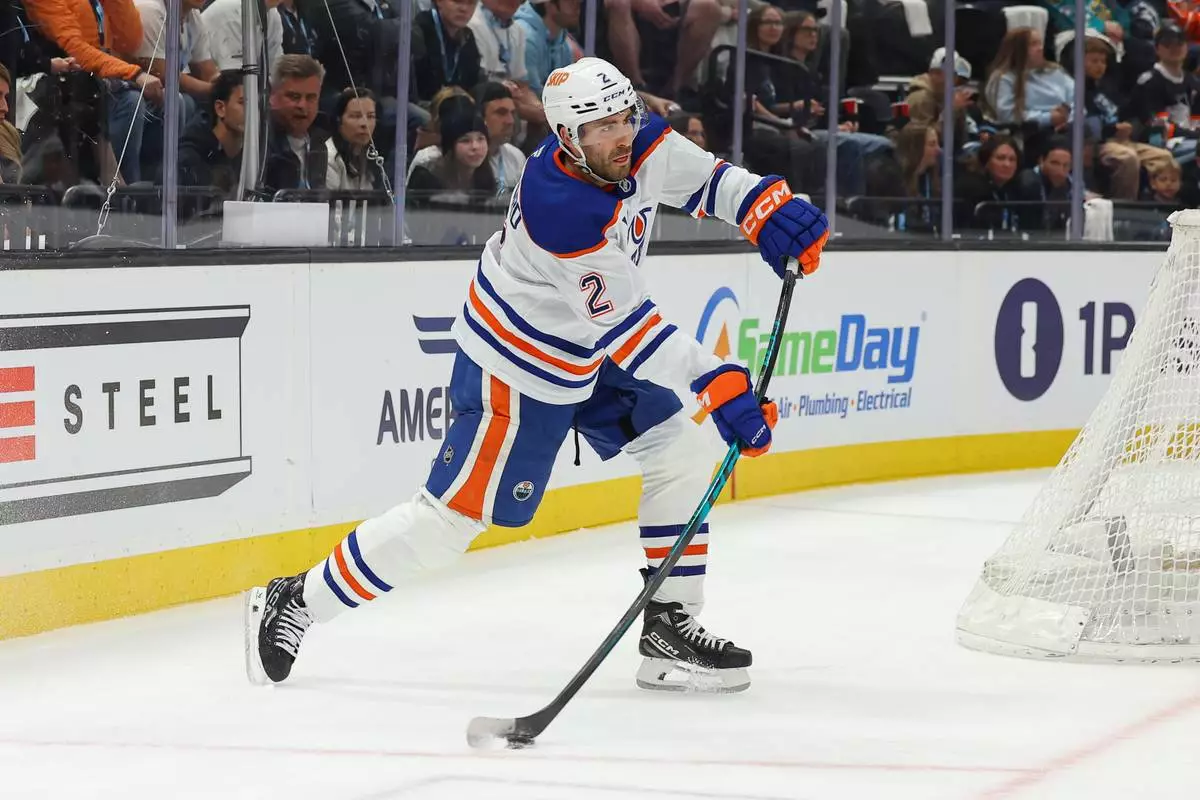 Edmonton Oilers defenseman Evan Bouchard (2) passes the puck against the Utah Mammoth during the second period of an NHL hockey game, Tuesday, March 24, 2026, in Salt Lake City. (AP Photo/Melissa Majchrzak)