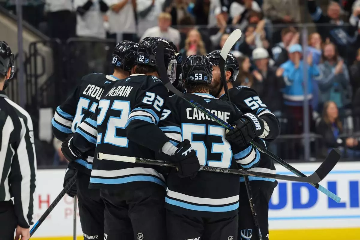 Utah Mammoth celebrate the goal against the Edmonton Oilers during the second period of an NHL hockey game, Tuesday, March 24, 2026, in Salt Lake City. (AP Photo/Melissa Majchrzak)