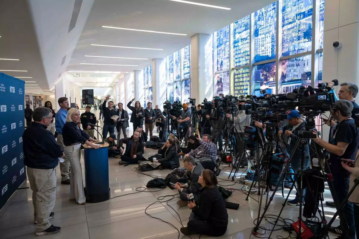 Jennifer Homendy, chair of the National Transportation Safety Board, speaks during a news conference in New York, Monday, March 23, 2026. (AP Photo/Seth Wenig)