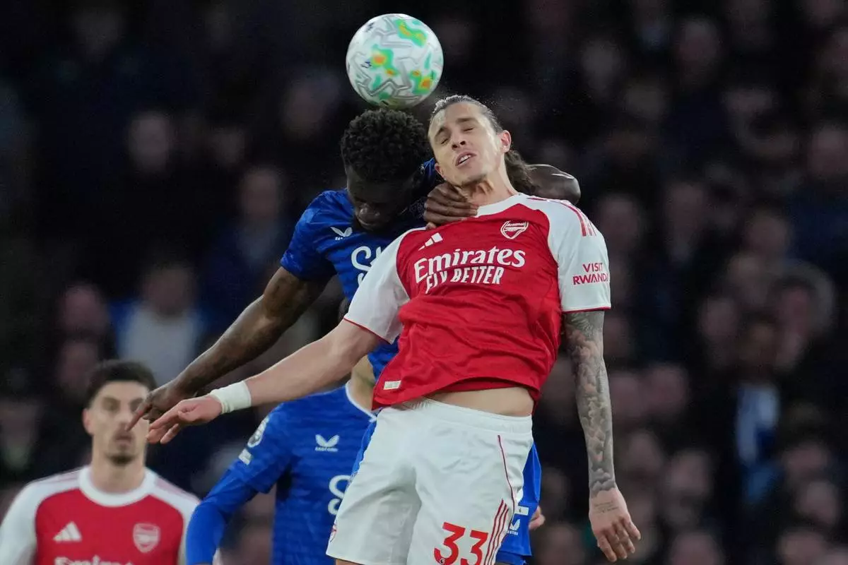 Everton's Tim Iroegbunam, left, and Arsenal's Riccardo Calafiori jump for the ball during the English Premier League soccer match between Arsenal and Everton in London, England, Saturday, March 14, 2026. (AP Photo/Kin Cheung)