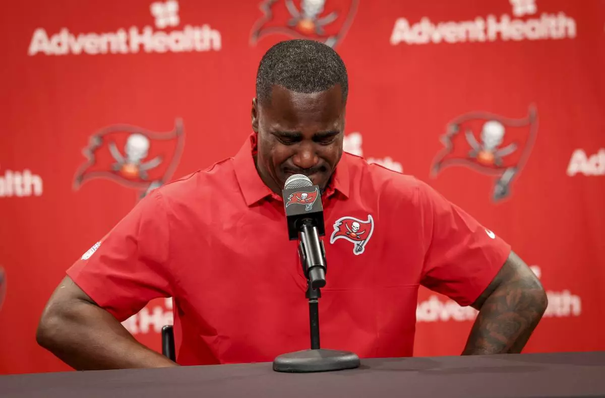 Tampa Bay Buccaneers' Lavonte David becomes emotional while talking about his parents as he announces his retirement during an NFL football news conference, Tuesday, March 24, 2026 in Tampa. (Chris Urso/Tampa Bay Times via AP)