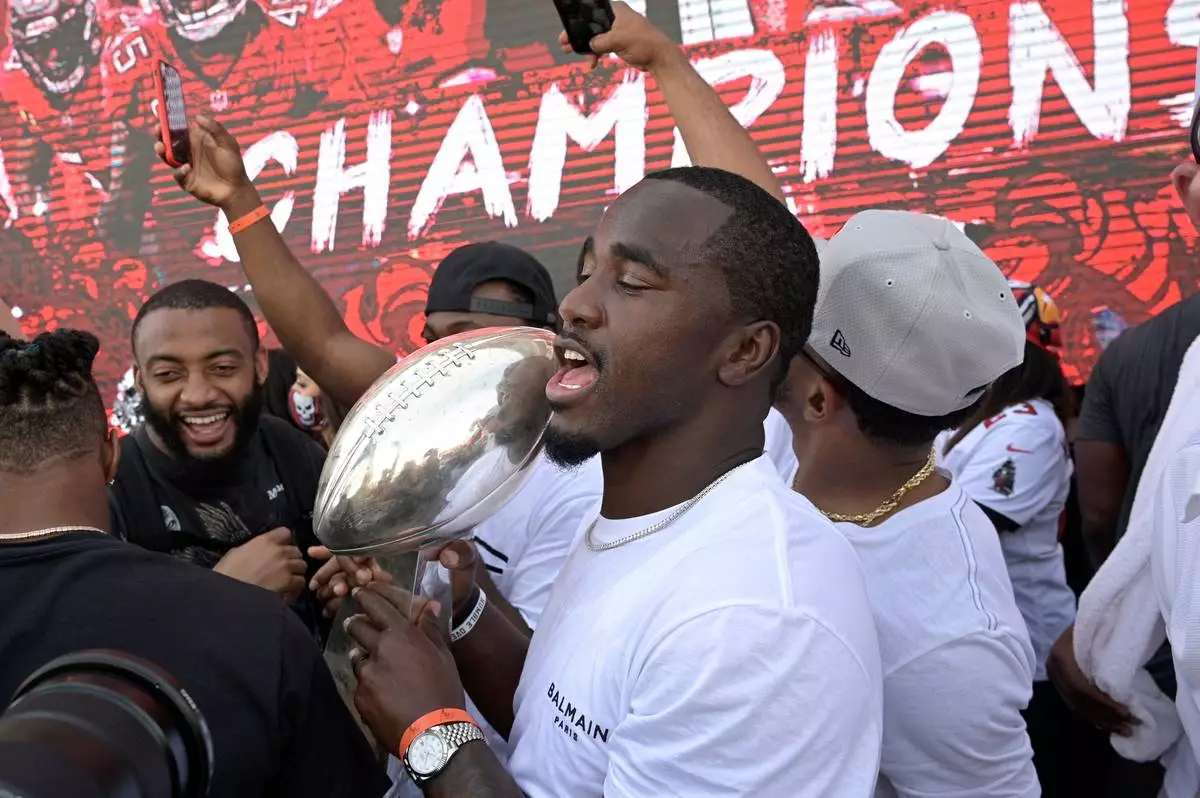 FILE - Tampa Bay Buccaneers linebacker Lavonte David holds the Vince Lombardi Trophy during a celebration of the team's Super Bowl 55 victory over the Kansas City Chiefs, Feb. 10, 2021, in Tampa, Fla. (AP Photo/Phelan M. Ebenhack, File)