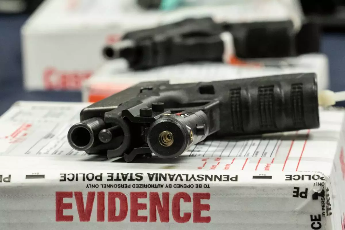 FILE - Shown are alleged straw purchased weapons displayed during a news conference in Norristown, Pa., Feb. 22, 2023. (AP Photo/Matt Rourke, File)