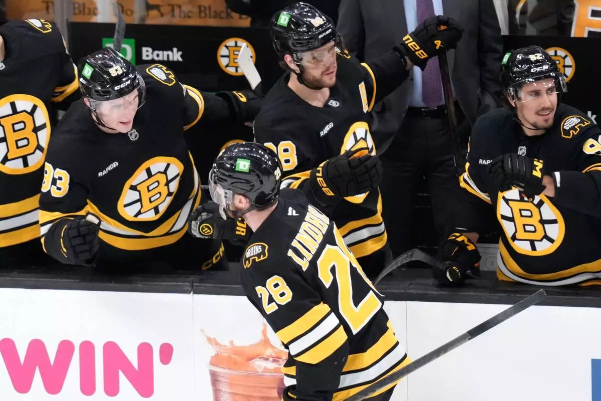 Boston Bruins center Elias Lindholm (28) is congratulated after his goal against the Toronto Maple Leafs during the first period of an NHL hockey game, Tuesday, March 24, 2026, in Boston. (AP Photo/Charles Krupa)