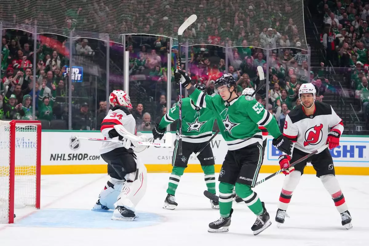 Dallas Stars center Wyatt Johnston (53) reacts after scoring a goal on New Jersey Devils goaltender Jake Allen (34) during the first period of an NHL hockey game Tuesday, March 24, 2026, in Dallas. (AP Photo/Julio Cortez)