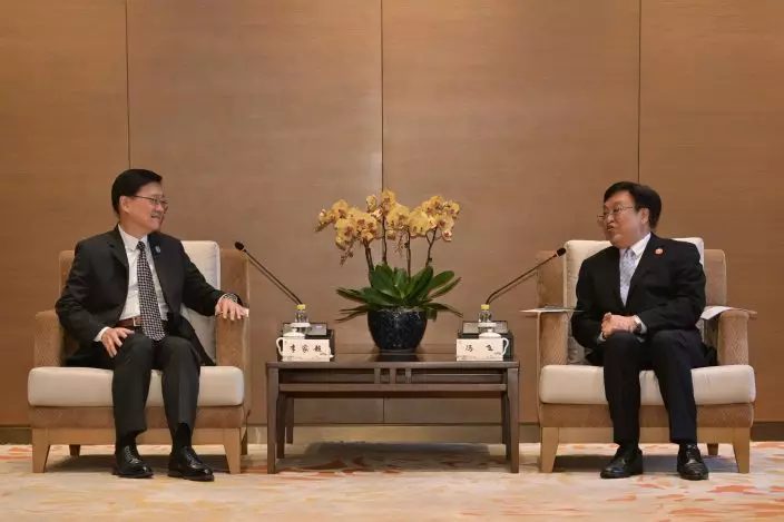 The Chief Executive, Mr John Lee (left), meets with Standing Committee Member of the CPC Hainan Provincial Committee and Secretary of the CPC Haikou Municipal Committee, Mr Fan Shaojun (right), in Hainan today (March 25). Source: HKSAR Government Press Releases