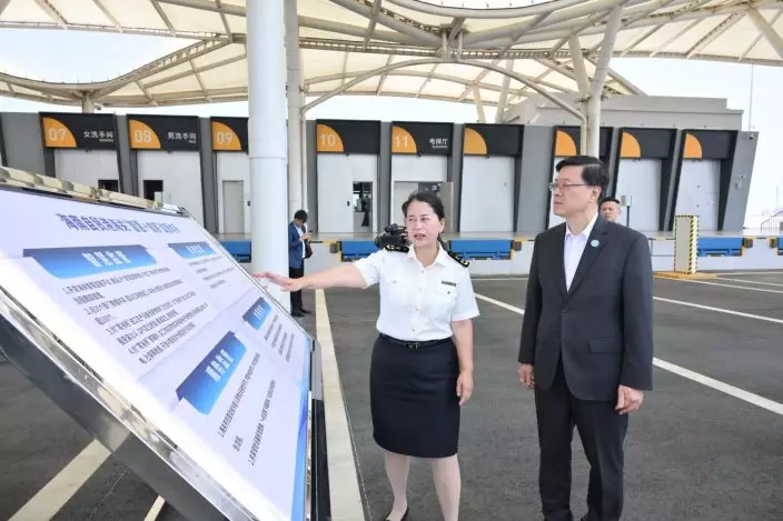 The Chief Executive, Mr John Lee, continued his visit programme in Hainan today (March 25). Photo shows Mr Lee (fourth right) visiting the centralised inspection site of the Nangang "Second-Line Port". Source: HKSAR Government Press Releases