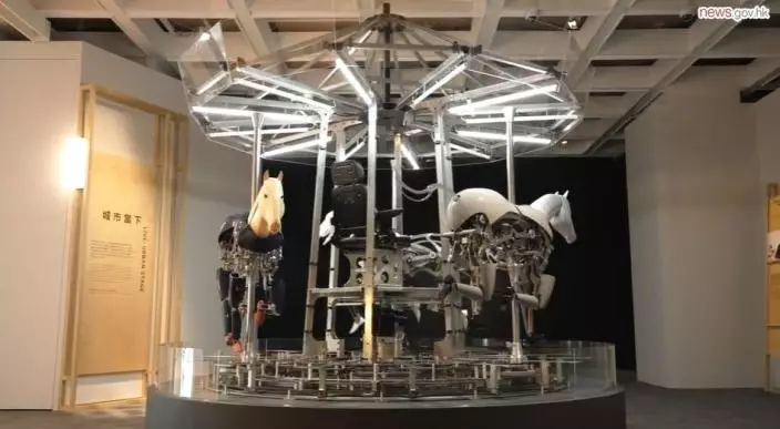 Meanwhile, kinetic installation artist Joseph Chan brings audiences a distinctive carousel making its public debut. Titled Pride of Labour, the fully mechanical work is assembled from machine parts. But there is something different about the three horses - upon closer inspection they are seen to walk on human legs.