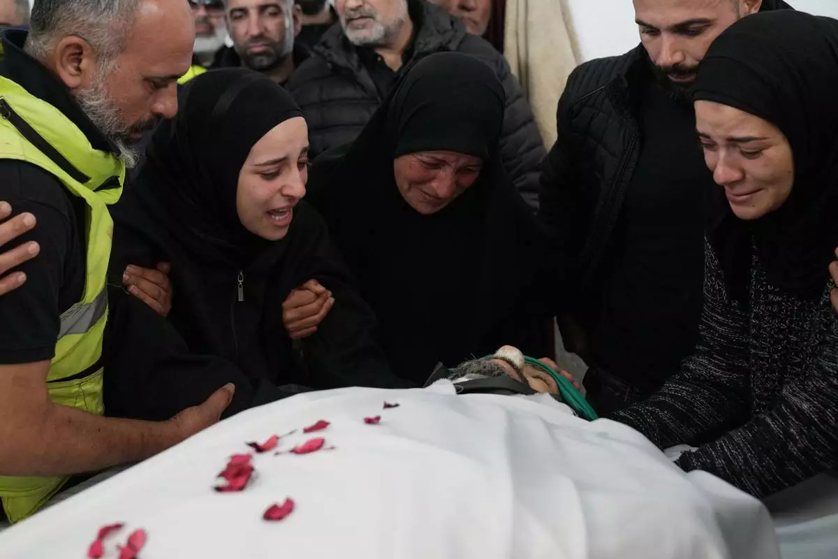 Family members of a paramedic who was killed in an Israeli airstrike, mourn over his body at a morgue, in Tyre, south Lebanon, Wednesday, March 25, 2026. (AP Photo/Hussein Malla)