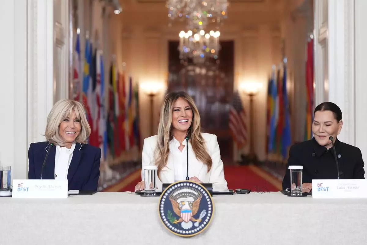 First lady Melania Trump speaks during a "Fostering the Future Together Global Coalition Summit," with Brigitte Macron, France, left, and Princess Lalla Hasnaa, Morocco, right, at the White House, Wednesday, March 25, 2026, in Washington. (AP Photo/Jacquelyn Martin)