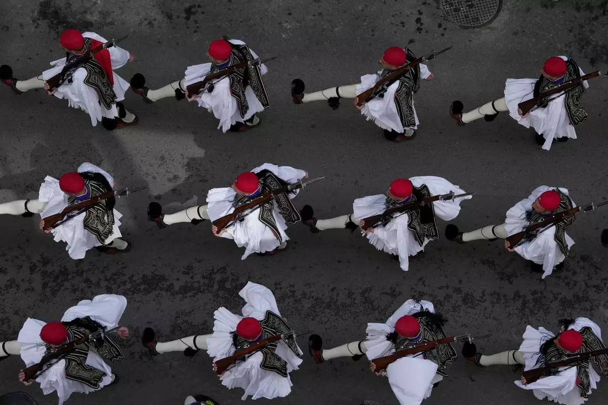 Presidential Guards also known as Evzones, take part in a military parade to commemorate the start of Greece's 1821 war of independence against the 400-year Ottoman rule, in Athens, on Wednesday, March 25, 2026. (AP Photo/Thanassis Stavrakis)