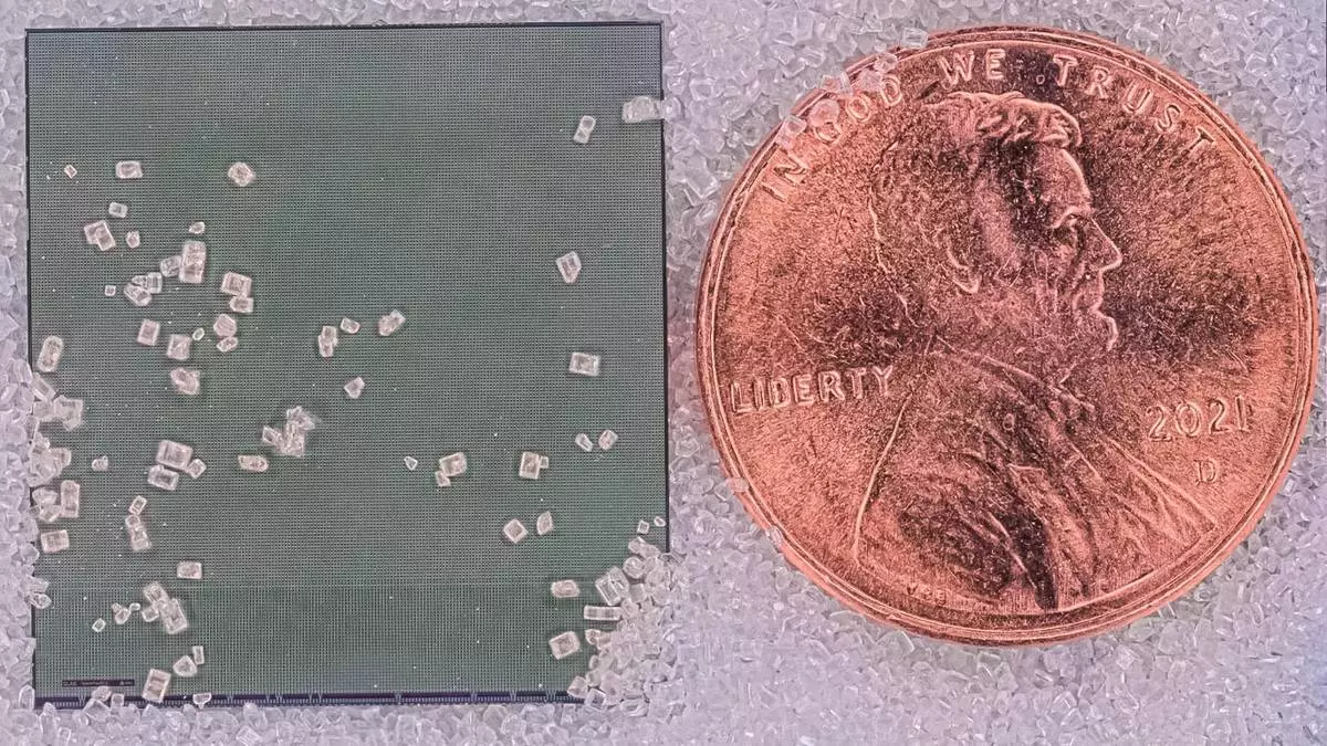 Silicon chip that integrates both imaging sensors and data compression, shown next to a U.S. penny and resting on grains of sand. This chip was co-designed by Argonne and SLAC. (Image by Antonino Miceli/Argonne National Laboratory.)
