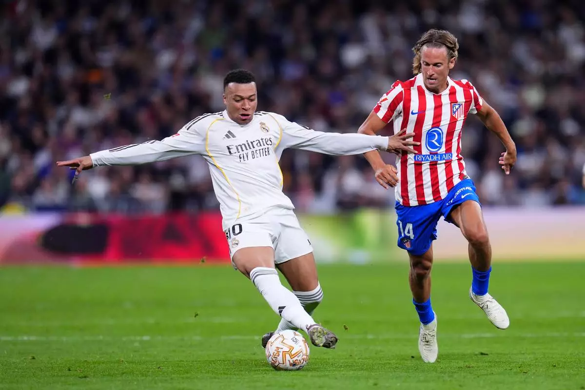 Real Madrid's Kylian Mbappe, left, and Atletico Madrid's Marcos Llorente challenge for the ball during the Spanish La Liga soccer match between Real Madrid and Atletico Madrid in Madrid, Spain, Sunday, March 22, 2026. (AP Photo/Manu Fernandez)