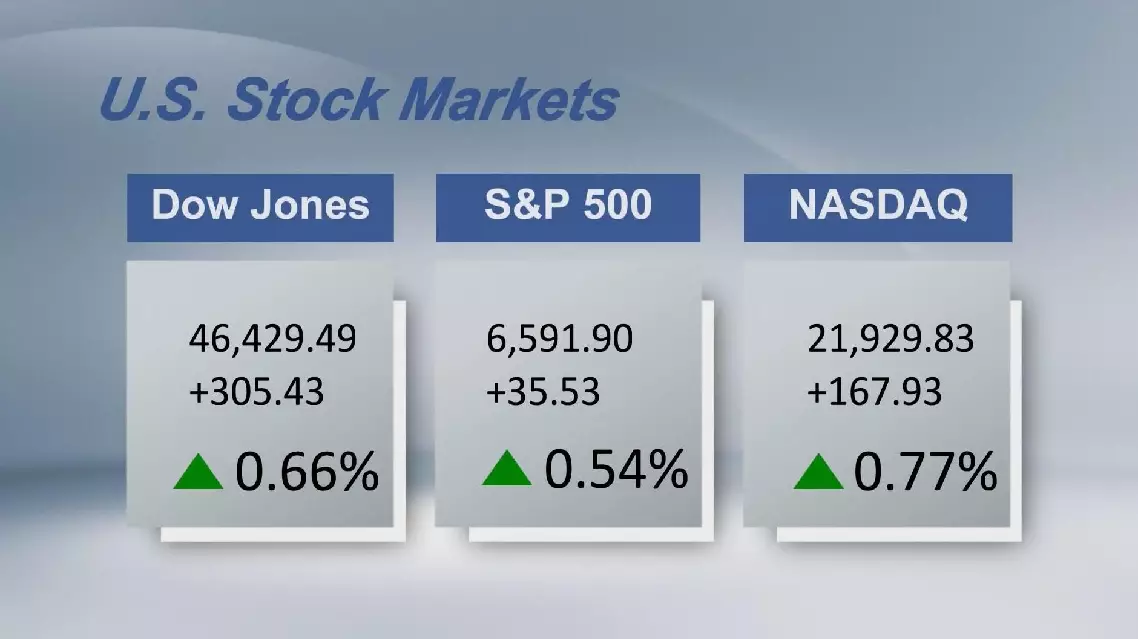The Dow Jones Industrial Average rose 305.43 points or 0.66 percent to 46,429.49. The S and P 500 added 35.53 points or 0.54 percent to 6,591.90. The Nasdaq Composite Index increased 167.93 points or 0.77 percent to 21,929.83.