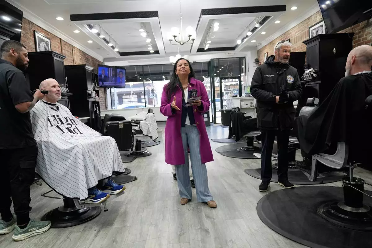 Analilia Mejia, the Democratic candidate running for New Jersey's 11th congressional district, talks to people at a barber shop in Morristown, N.J., Tuesday, March 24, 2026. (AP Photo/Seth Wenig)