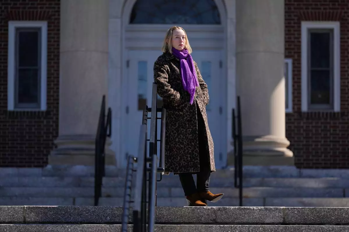 Allison Posner, an organizer for an upcoming "No Kings" protest poses for a photo on the steps of the town hall in Maplewood, N.J., Tuesday, March 24, 2026. (AP Photo/Seth Wenig)