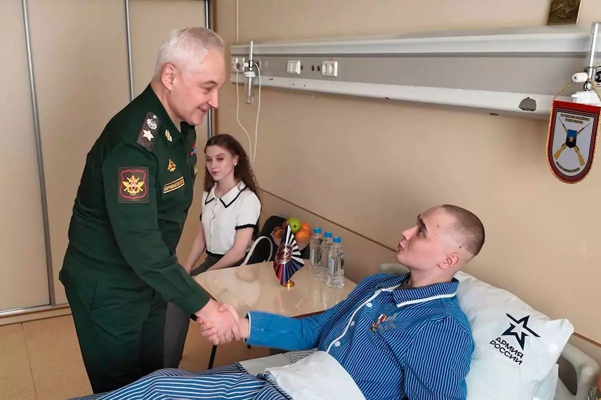 In this image made from video provided by Russian Defense Ministry Press Service on Tuesday, March 24, 2026, Russian Minister of Defense Andrei Belousov, left, presents the "Gold Star" Hiro of Russia medal to a participant of the military action in Ukraine, Private Sergei Yarashev, at The National Medical Research Center of Surgery in Moscow. (Russian Defense Ministry Press Service via AP)