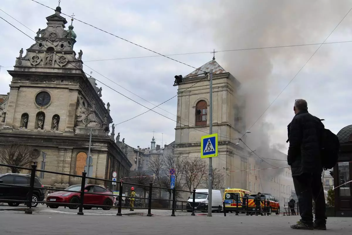 Fire and smoke raises above the city center following Russia's drone attack in Lviv, Ukraine, Tuesday, March 24, 2026. (AP Photo/Mykola Tys)