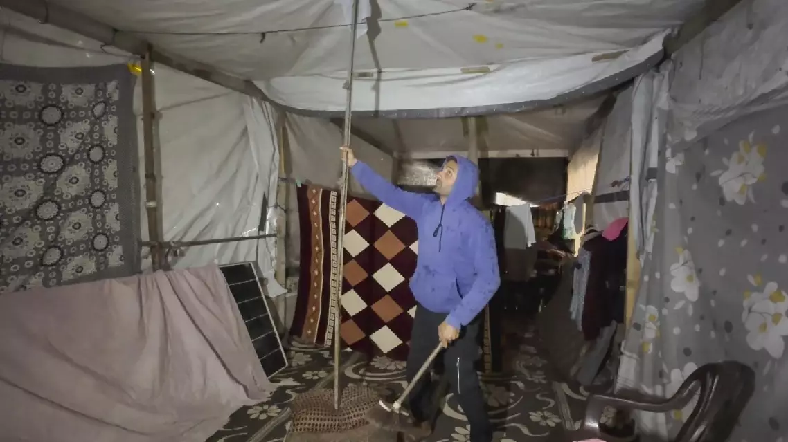 "As you can see, the tent collapsed on us and water has leaked inside. I keep trying to drain the water away from my children and me, but it's coming in from everywhere. As you can see, all our clothes are soaked," said displaced Palestinian Mohammed Saadallah.