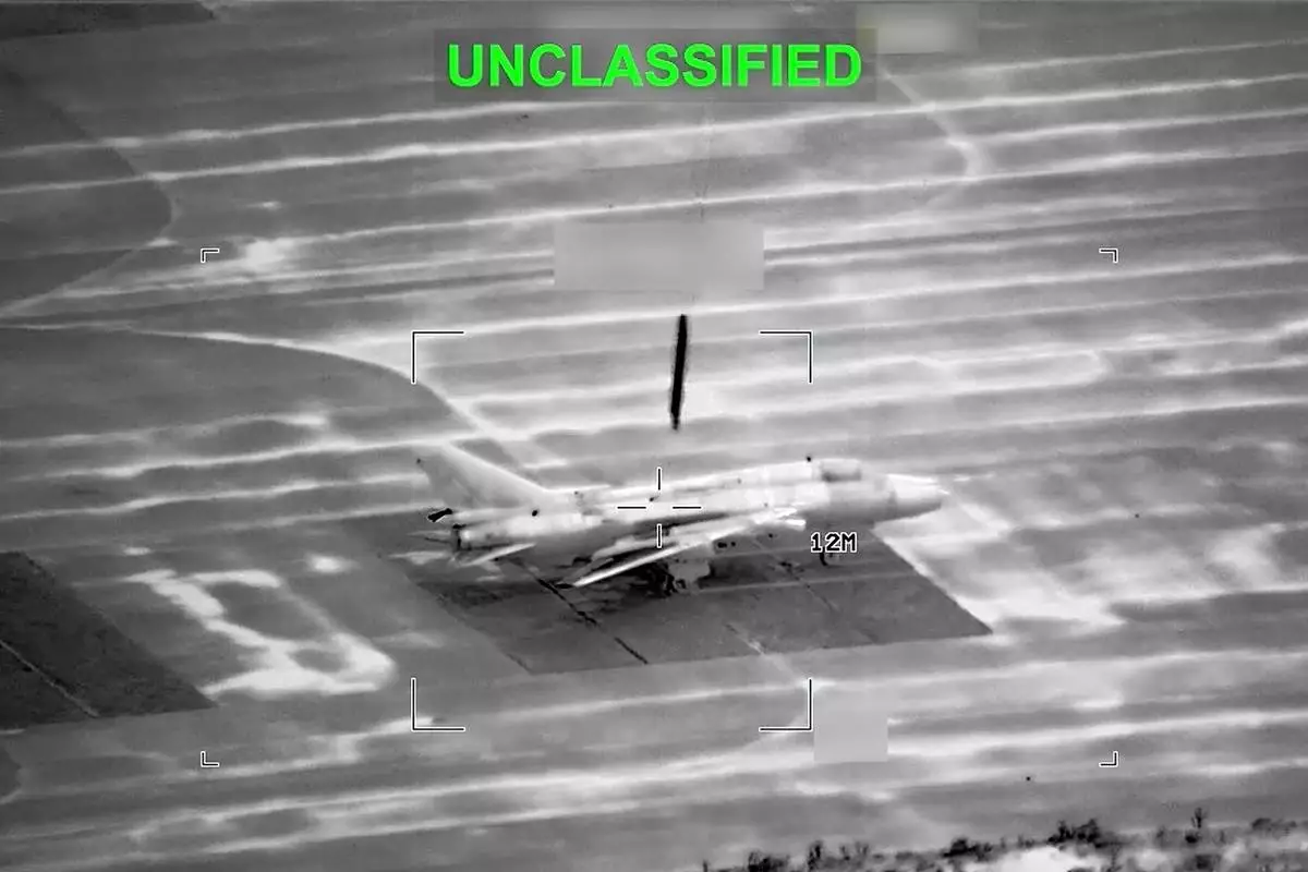This partially redacted image from video provided by U.S. Central Command shows a military aircraft in Iran shortly before it was struck by a missile fired by U.S. forces on Sunday, March 1, 2026. (U.S. Central Command via AP)