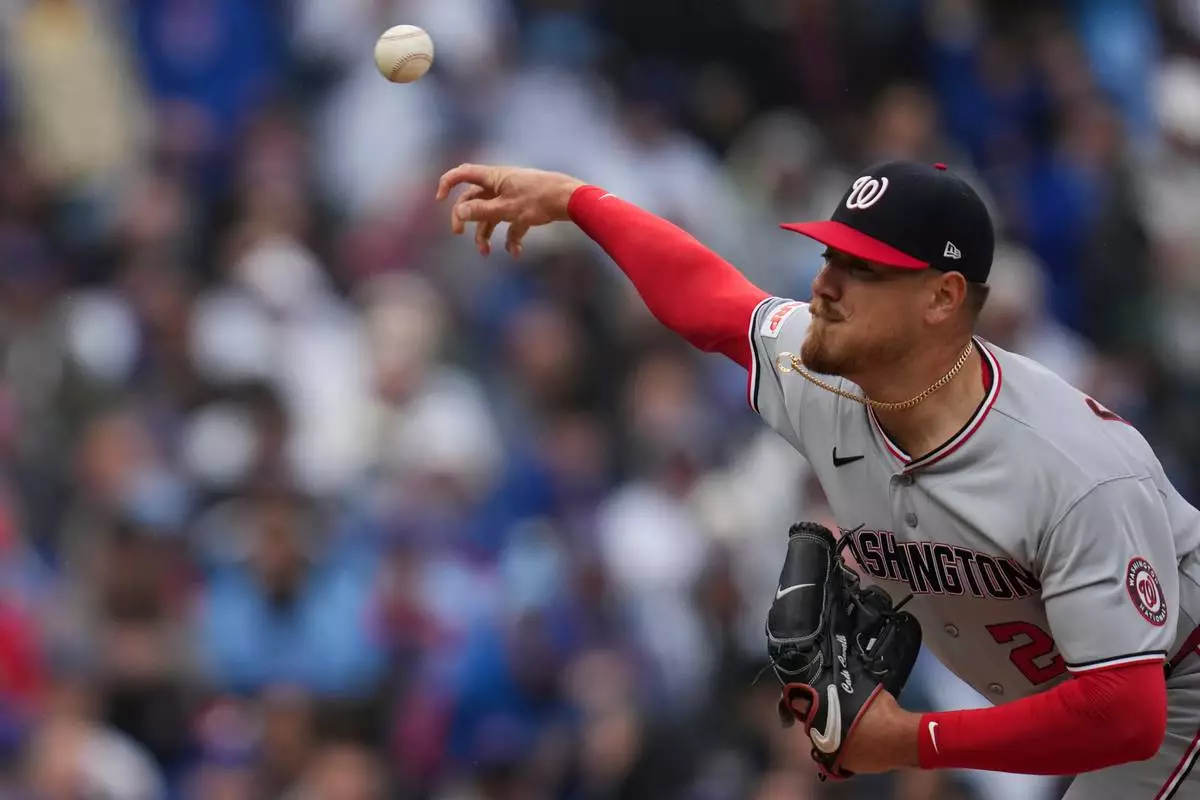 Washington Nationals starting pitcher Cade Cavalli (24) throws against the Chicago Cubs during the first inning of an opening-day baseball game Thursday, March 26, 2026, in Chicago. (AP Photo/Erin Hooley)